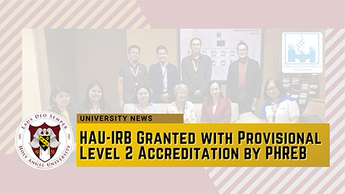 The Philippine Health Research Ethics Board (PHREB) has granted Holy Angel University’s Institutional Review Board (IRB) a provisional Level 2 accreditation which is effective until March 23, 2022. This status is awarded within less than a year of being granted renewal of its Level 1 accreditation last June 09, 2020. Furthermore, the Committee on Standards and Accreditation of PHREB is giving six months to submit additional documents to qualify for a full three-year Level 2 accreditation status.